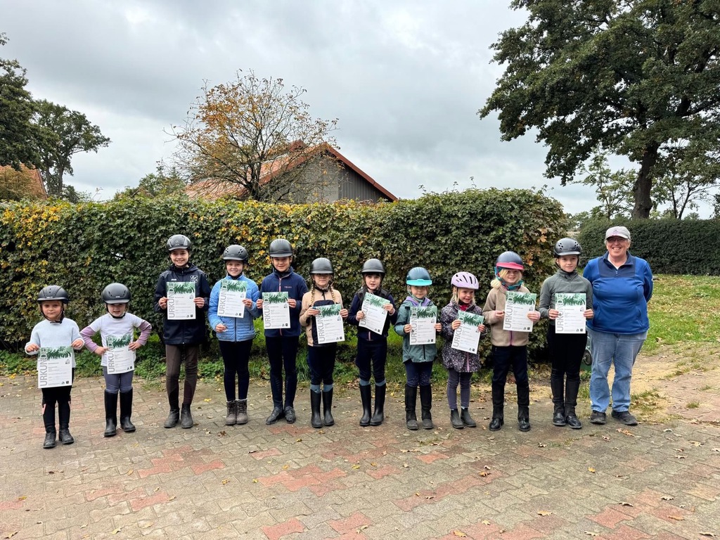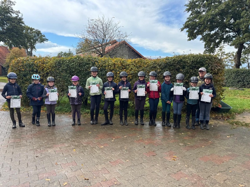 Neunzehn Teilnehmerinnen nutzten die Gelegenheit auf dem Hof Bertram am 3. Oktober bei bestem Herbstwetter Reitabzeichen sechs, fünf und vier und den Pferdeführerschein abzulegen. Die Reiterinnen waren in den letzten Wochen durch Lehrgangsleiterin Marietta Bertram gründlich vorbereitet worden in Dressur, Springen und Theorie. Die Richterinnen Catalina Münkel und Katharina Siebert-Reiting waren mit den gezeigten Leistungen und dem Wissen der Prüflinge sehr zufrieden und konnten am Ende allen Teilnehmerinnen ihre Urkunde zum bestandenen Abzeichen aushändigen.